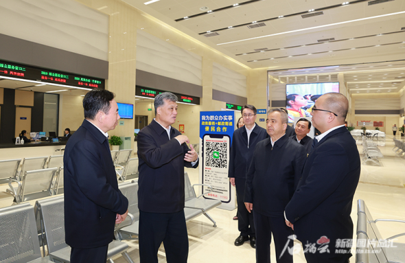 3月26日,自治区党委书记马兴瑞、自治区主席艾尔肯·吐尼亚孜来到自治区政务服务大厅,察看窗口设置和业务办理状况,听取数字政府建设等工作介绍。石榴云/新疆日报记者崔志坚摄