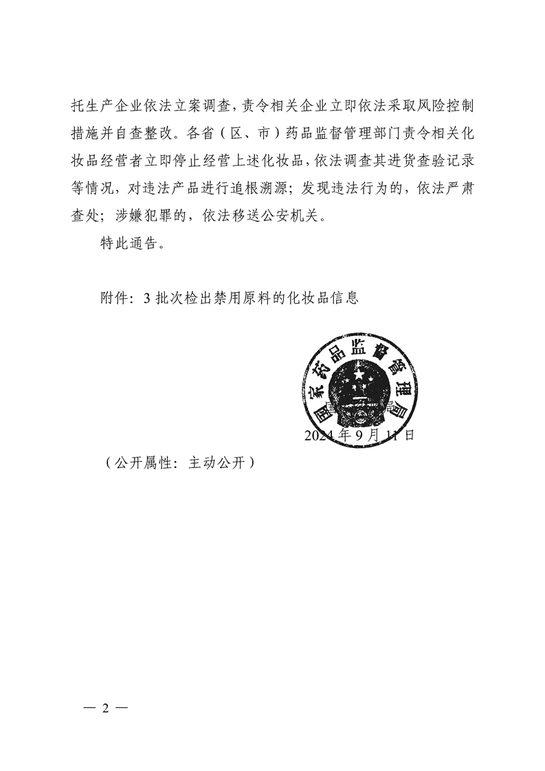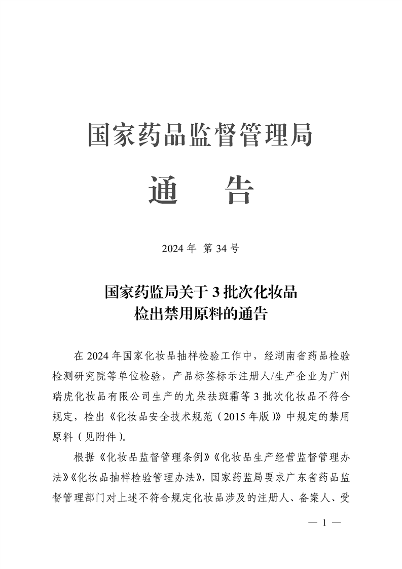 国家药监局关于3批次化妆品检出禁用原料的通告(2024年第34号)