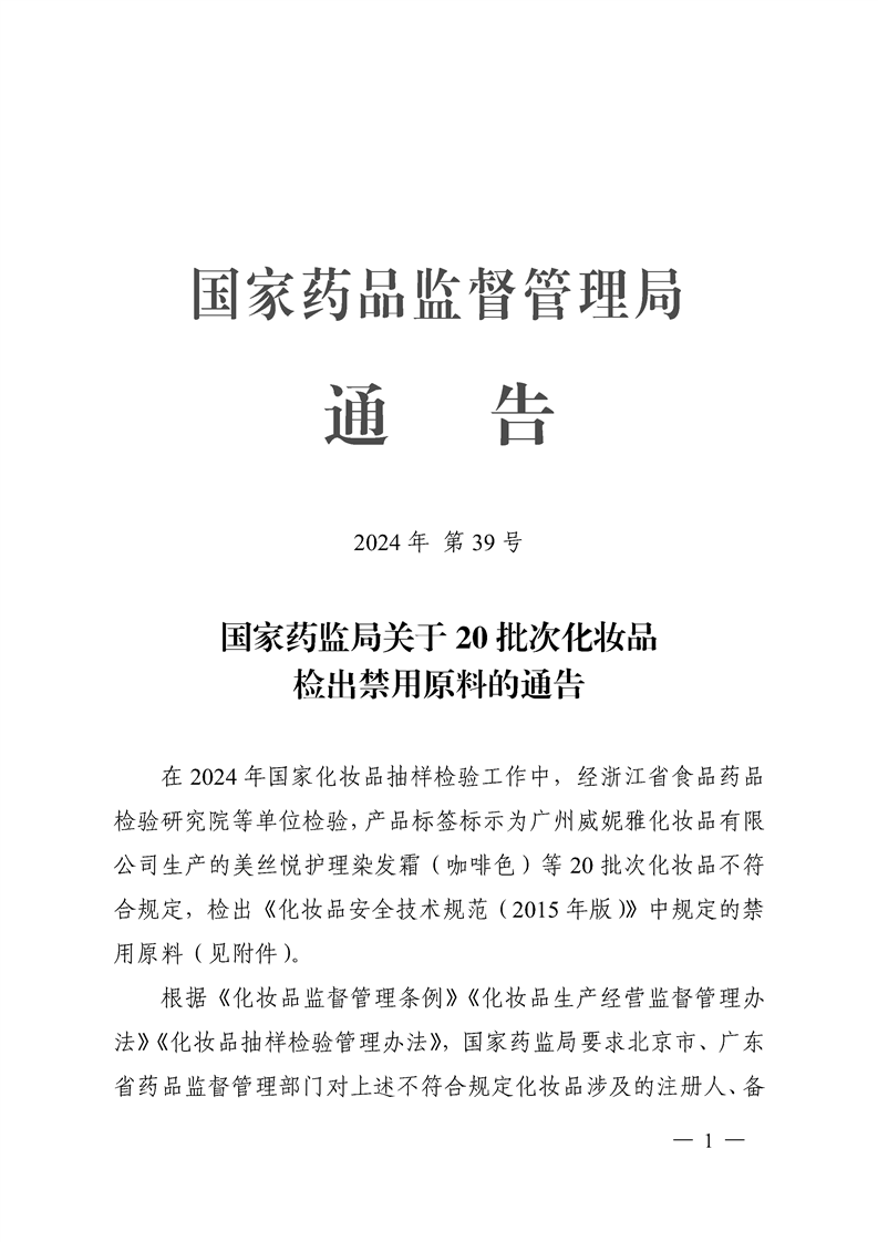 国家药监局关于20批次化妆品检出禁用原料的通告(2024年第39号)