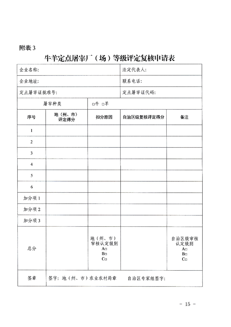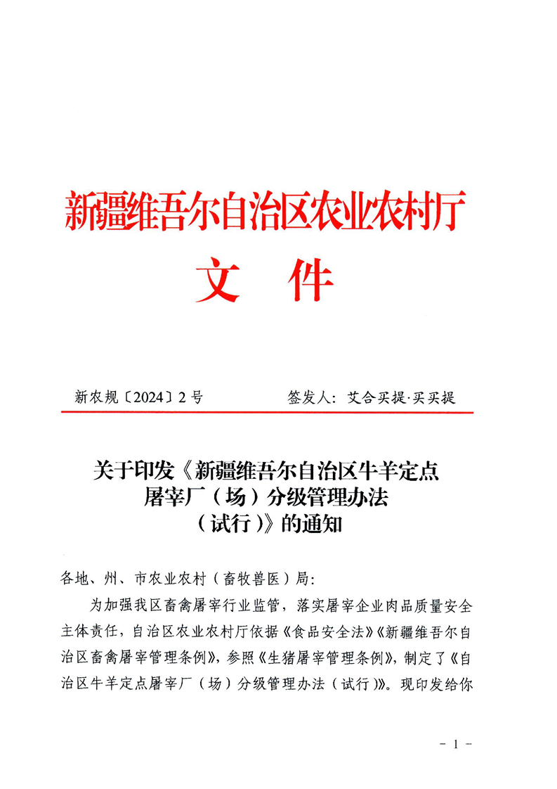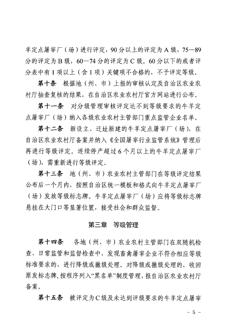 【本部门规范性文件】关于印发《新疆维吾尔自治区牛羊定点屠宰厂(场)分级管理办法(试行)》的通知