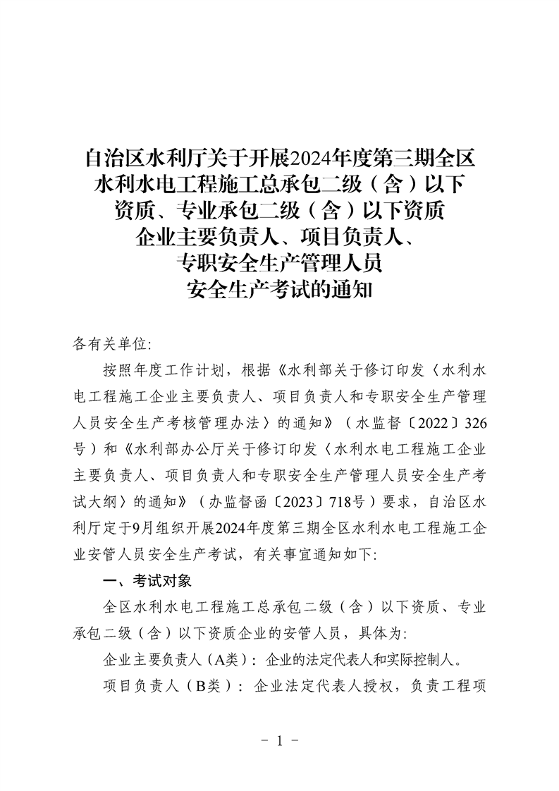 自治区水利厅关于开展2024年度第三期全区水利水电工程施工总承包二级(含)以下资质、专业承包二级(含)以下资质企业主要负责人、项目负责人、专职安全生产管理人员安全生产考试的通知