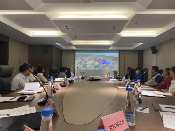 为大力发展新疆体育产业,提升新疆体育人的思想意识,结合中国新疆第十四届环赛里木湖公路自行车赛活动,近日,特邀请国家体育总局自行车击剑运动管理中心和中国自行车运动协会前来观摩指导赛事工作,同步组织召开了由自治区体育局主办、体育产业发展中心牵头的自行车及体育赛事活动研讨会。国家体育总局自行车击剑运动管理中心副主任、中国自行车运动协会副主任冯宝忠、中国自行车运动协会竞赛服务部副部长珏琼、自治区体育局党组成员、副局长姜世才和各地(州、市)体育行政部门代表参加了研讨会,自治区体育局体育产业发展中心主任刘涛主持了会议。