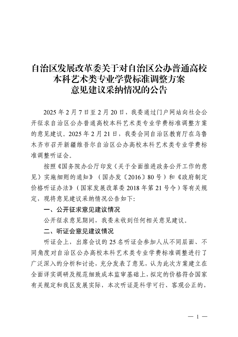 自治区发展改革委关于对自治区公办普通高校本科艺术类专业学费标准调整方案意见建议采纳情况的公告